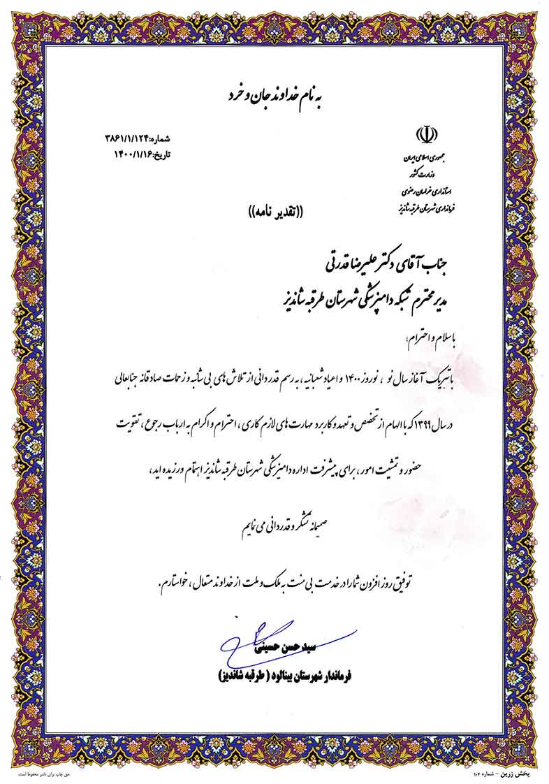 در این دیدار فرماندار محترم ضمن تقدیر از عملکرد شبکه دامپزشکی و قدردانی از زحمات و اقدامات صورت گرفته در راستای ارتقای اهداف سازمان دامپزشکی کشور و تکریم ارباب رجوع گفت: ضمن قدردانی از تلاش های بی شائبه و زحمات صادقانه جنابعالی در سال 99 که با الهام از تخصص و تعهد و کاربرد مهارت های لازم کاری، احترام و اکرام ارباب رجوع، تقویت حضور و تمشیت امور، برای پیشرفت اداره دامپزشکی شهرستان طرقبه شاندیز اهتمام ورزیده اید، صمیمانه تشکر و قدردانی می نمایم.