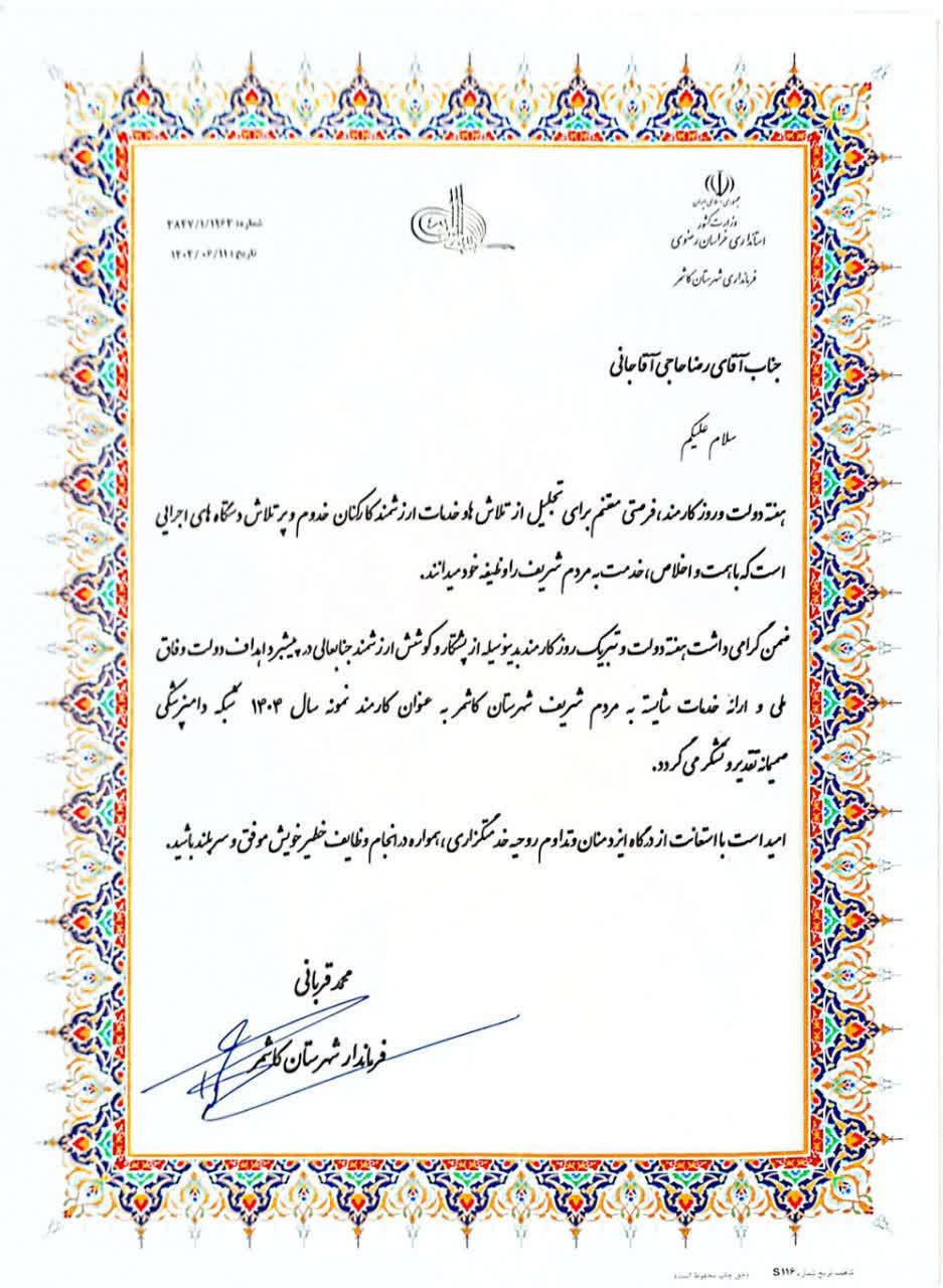 تقدیر فرماندار کاشمر از کارمند نمونه شبکه دامپزشکی شهرستان