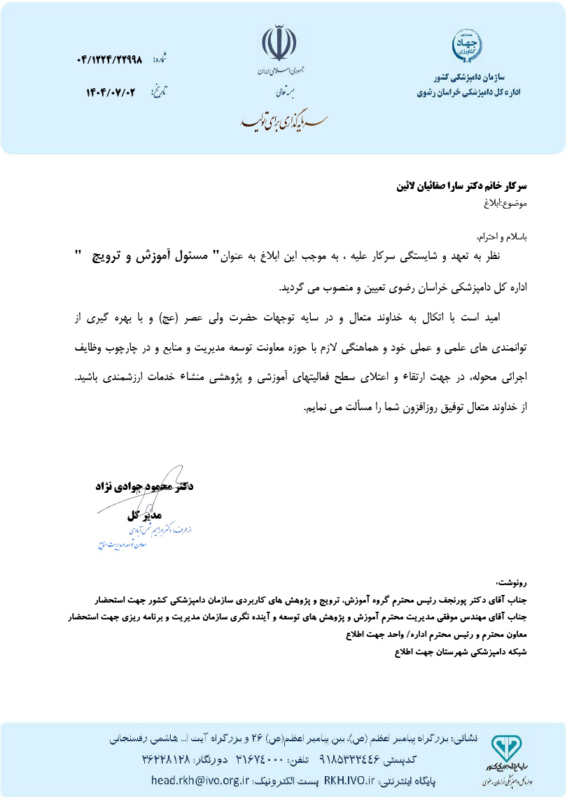 با حکم مدیر کل دامپزشکی خراسان رضوی، «سارا صفائیان لائین» به عنوان کارشناس مسئول آموزش و ترویج اداره کل دامپزشکی استان منصوب شد.