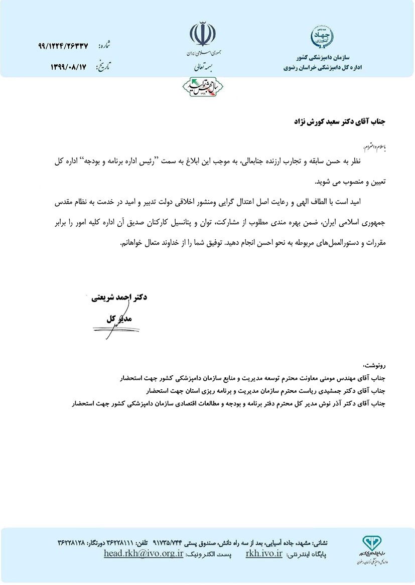طی حکمی که از سوی مدیر کل دامپزشکی استان خراسان رضوی صادر شد، دکتر سعید کورش نژاد به عنوان رییس اداره برنامه و بودجه این اداره کل منصوب شد.