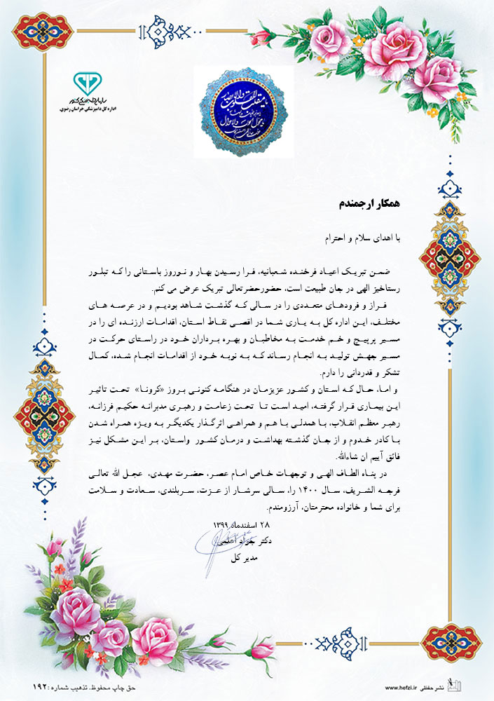 در پناه الطاف الهی و توجهات خاص امام عصر، حضرت مهدی، عجل الله تعالی فرجه الشریف، سال 1400 را، سالی سرشار از عزت، سربلندی، سعادت و سلامت برای شما و خانواده محترمتان، آرزومندم.