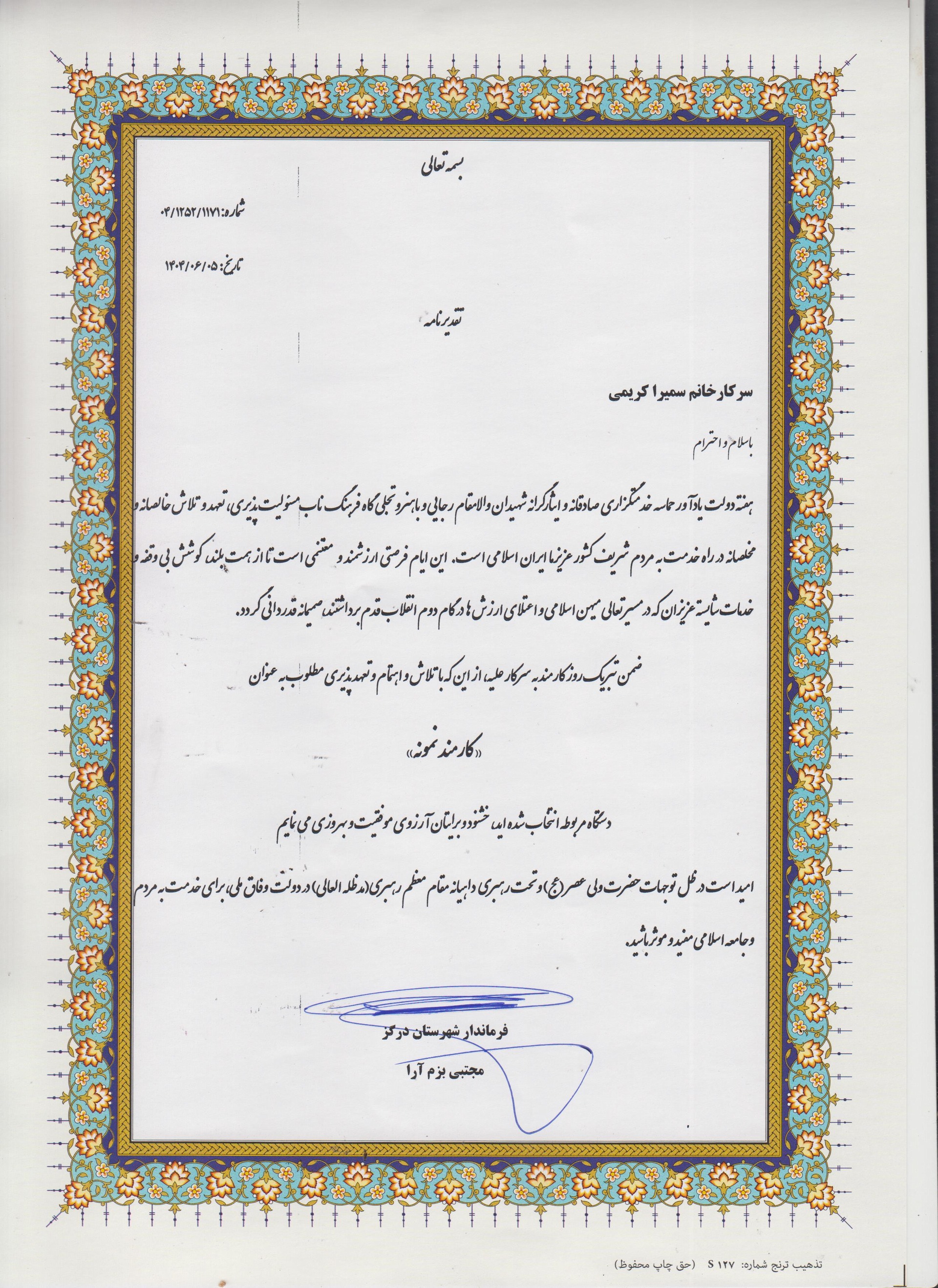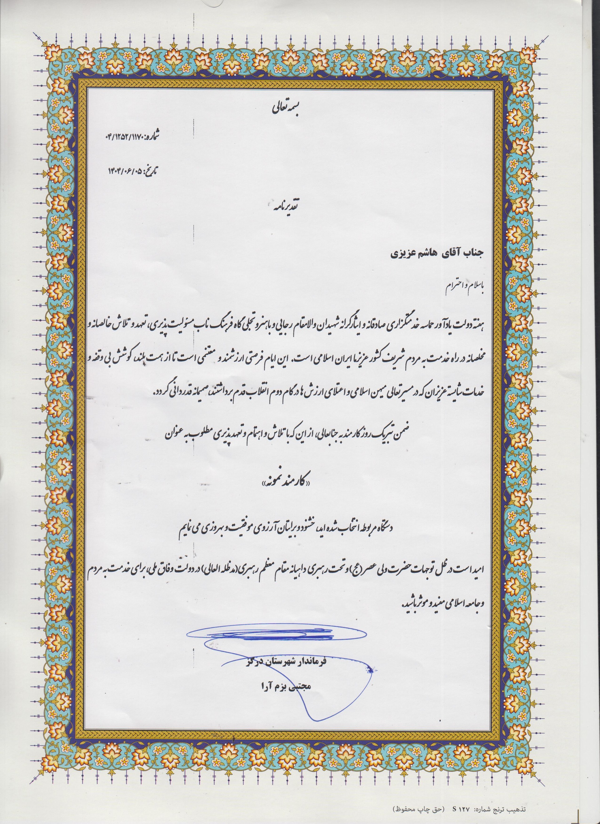 دکتر سعید دلفراز، سرپرست شبکه دامپزشکی شهرستان درگز در این باره گفت: در مراسم گرامیداشت هفته دولت، از کارمندان نمونه ادارات شهرستان از جمله شبکه دامپزشکی در محل فرمانداری با اهداء لوح تقدیر، تجلیل گردید.