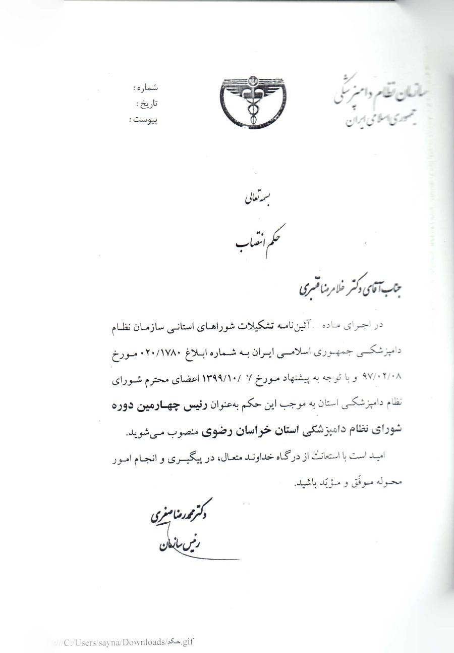با حکم رییس سازمان نظام دامپزشکی جمهوری اسلامی ایران، دکتر غلامرضا قنبری به عنوان رییس جدید شورای نظام دامپزشکی استان خراسان رضوی منصوب شد.