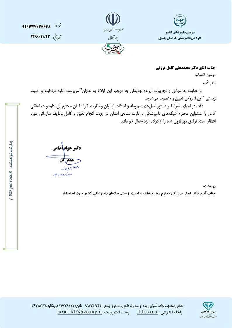 طی حکمی از سوی مدیر کل دامپزشکی استان خراسان رضوی، دکتر محمدعلی کامل فرزنی به عنوان سرپرست اداره قرنطنیه و امنیت زیستی این اداره کل منصوب شد.
