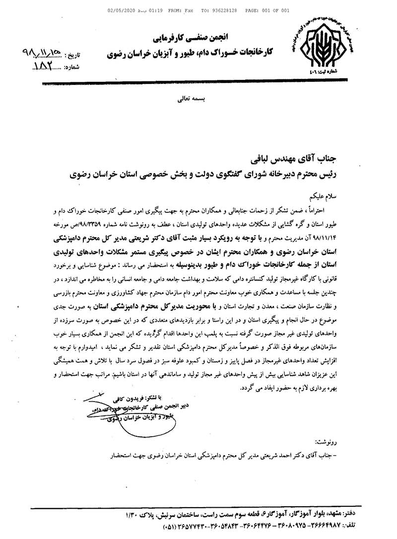 انجمن صنفی کارخانجات خوراک دام، طیور و آبزیان استان از مدیر کل دامپزشکی خراسان رضوی قدردانی کرد.