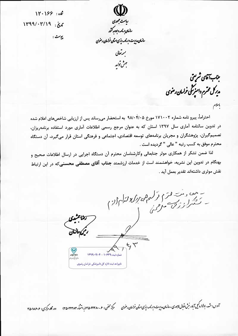 دکتر رضا جمشیدی، طی مکاتبه ای ضمن قدردانی از اقدامات انجام شده در این راستا، از تلاش های ارزشمند مهندس مصطفی محسنی، کارشناس این اداره کل نیز که در تهیه سالنامه آماری نقش موثری داشته است تقدیر کرد.