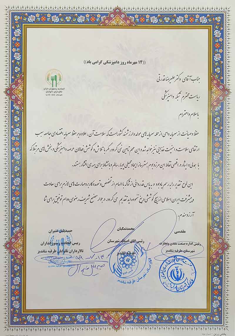 از سرپرست شبکه دامپزشکی بینالود و پرسنل شبکه در نشستی با روسای اتحادیه رستوران داران، اتاقاصناف و  اداره صنعت، معدن و تجارت شهرستان به مناسبت روز ملی دامپزشکی تقدیر شد.