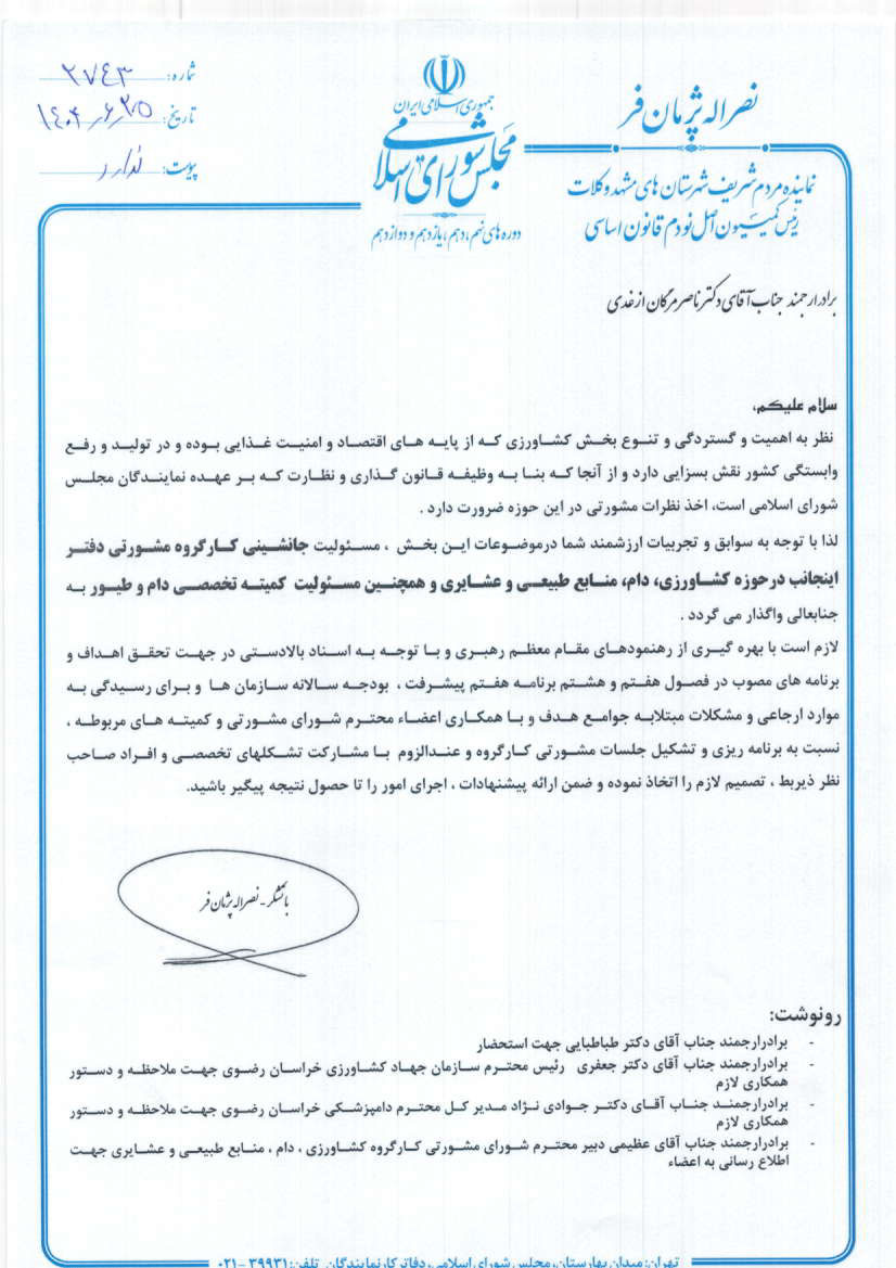 انتصاب دکتر ناصر مرگان ازغدی به عنوان جانشین کارگروه دفتر مشورتی رئیس کمیسیون اصل 90 مجلس شورای اسلامی در حوزه کشاورزی، دام، منابع طبیعی و عشایری