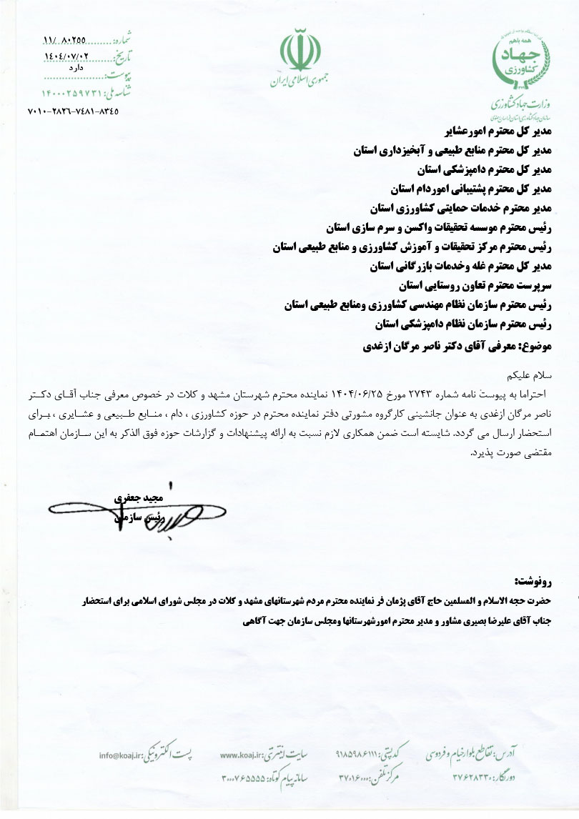 همچنین رئیس سازمان جهاد کشاورزی استان نیز ضمن ارسال این ابلاغ به تمامی ادارات تابعه از مدیران این واحدها خواست تا همکاری لازم را با دکتر ناصر مرگان ازغدی در مسئولیت جدید داشته باشند.