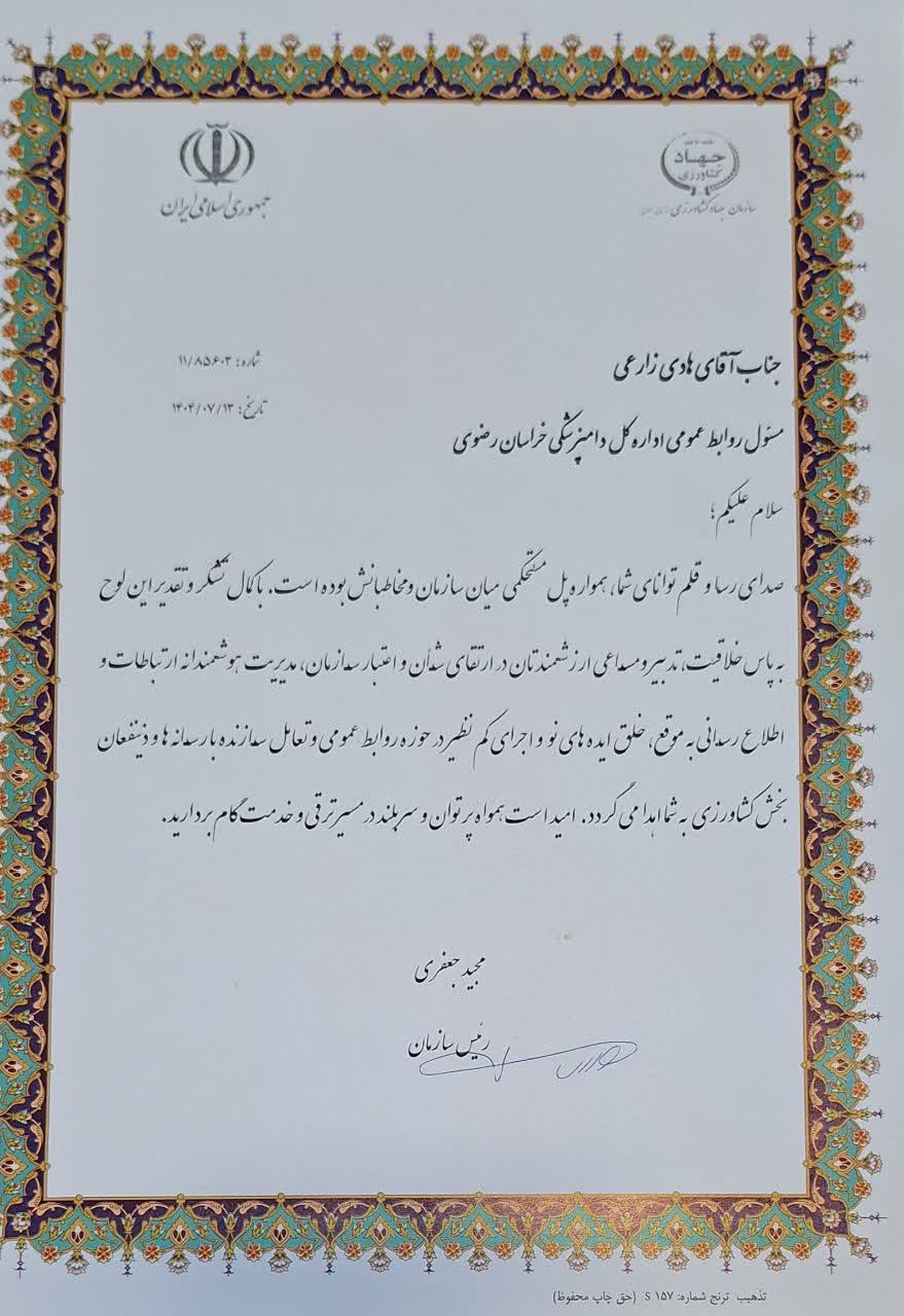 قدردانی رئیس سازمان جهاد کشاورزی استان از مدیر روابط عمومی اداره کل دامپزشکی خراسان رضوی