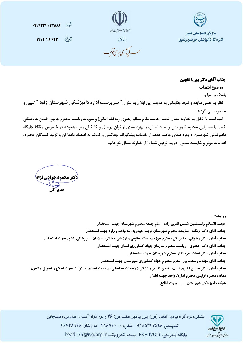 با حکم صادره از سوی مدیر کل دامپزشکی خراسان رضوی، دکتر «پوریا گلچین» به عنوان سرپرست جدید شبکه دامپزشکی شهرستان زاوه منصوب شد.