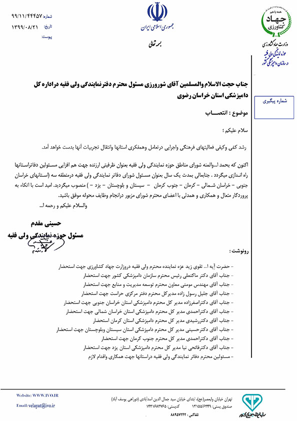 انتصاب مسئول دفتر نمایندگی ولی در اداره کل دامپزشکی استان خراسان رضوی به عنوان مسئول شورای دفاتر منطقه 3 ادارات کل