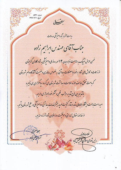 ضمن عرض تبریک به مناسبت فرارسیدن 14 مهر ، روز ملی دامپزشکی به شما و همکاران گرامی تان از زحمات و تلاش های شما در برخورد با معضلات بهداشتی ، به خصوص ساماندهی وضعیت کشتارگاه دام شهرستان که باعث تحقق اهداف حوزه سلامت و بهداشت شهرستان می گردد سپاسگزاری می نماییم و با تقدیم این لوح تقدیر ، مراتب قلبی و تشکر خود را ابراز می داریم.