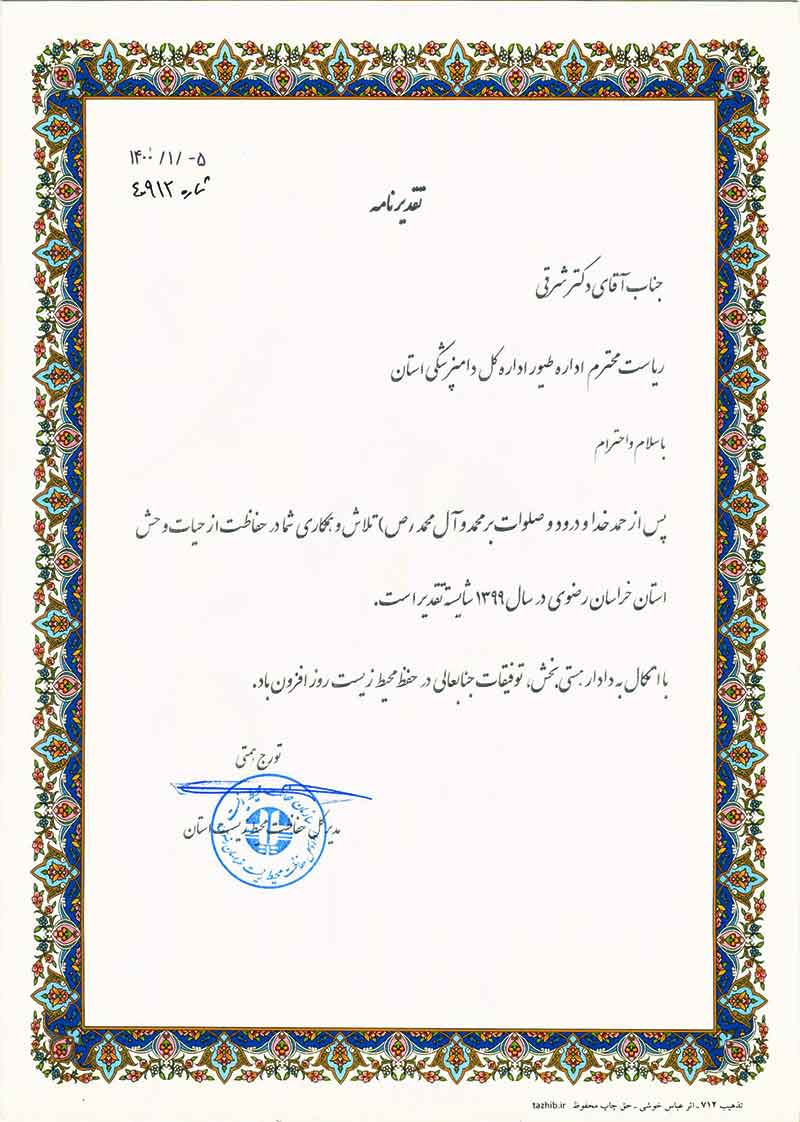 تقدیر مدیر کل حفاظت محیط زیست خراسان رضوی از رییس اداره بهداشت و مدیریت بیماری های طیور اداره کل دامپزشکی
